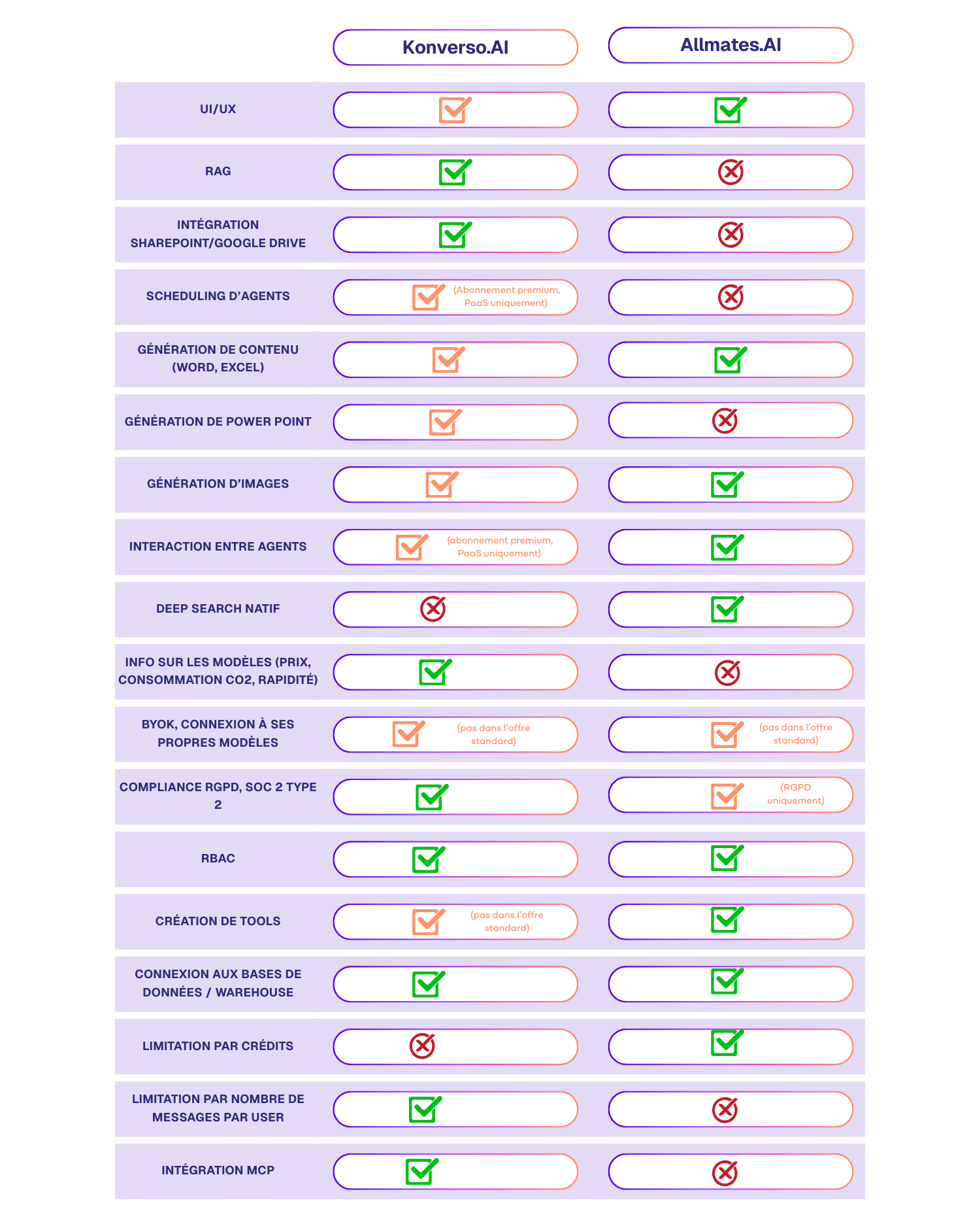 Pour ce cas d’usage spécifique, Konverso se différencie de Allmates et produti un résultat plus conforme à nos attentes.